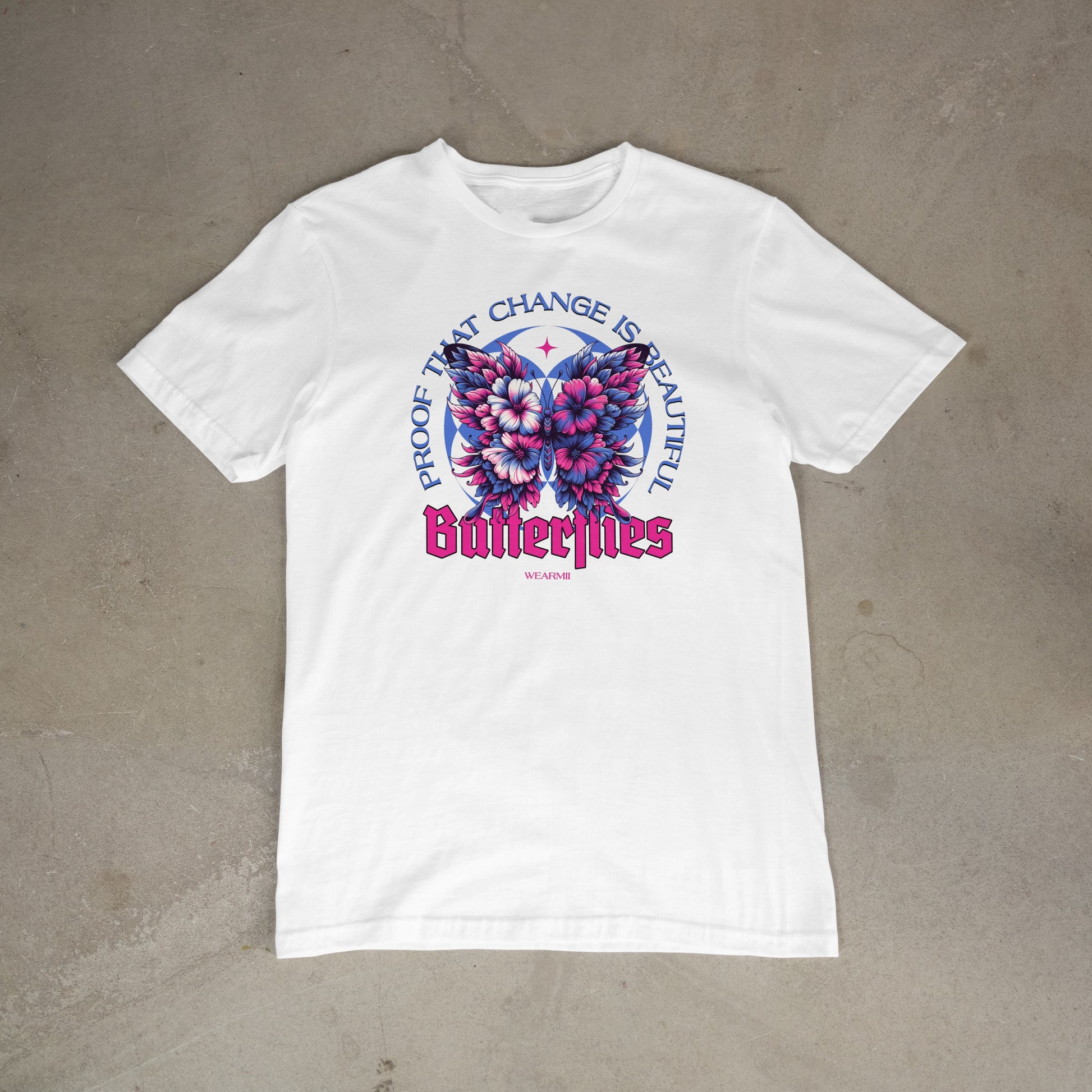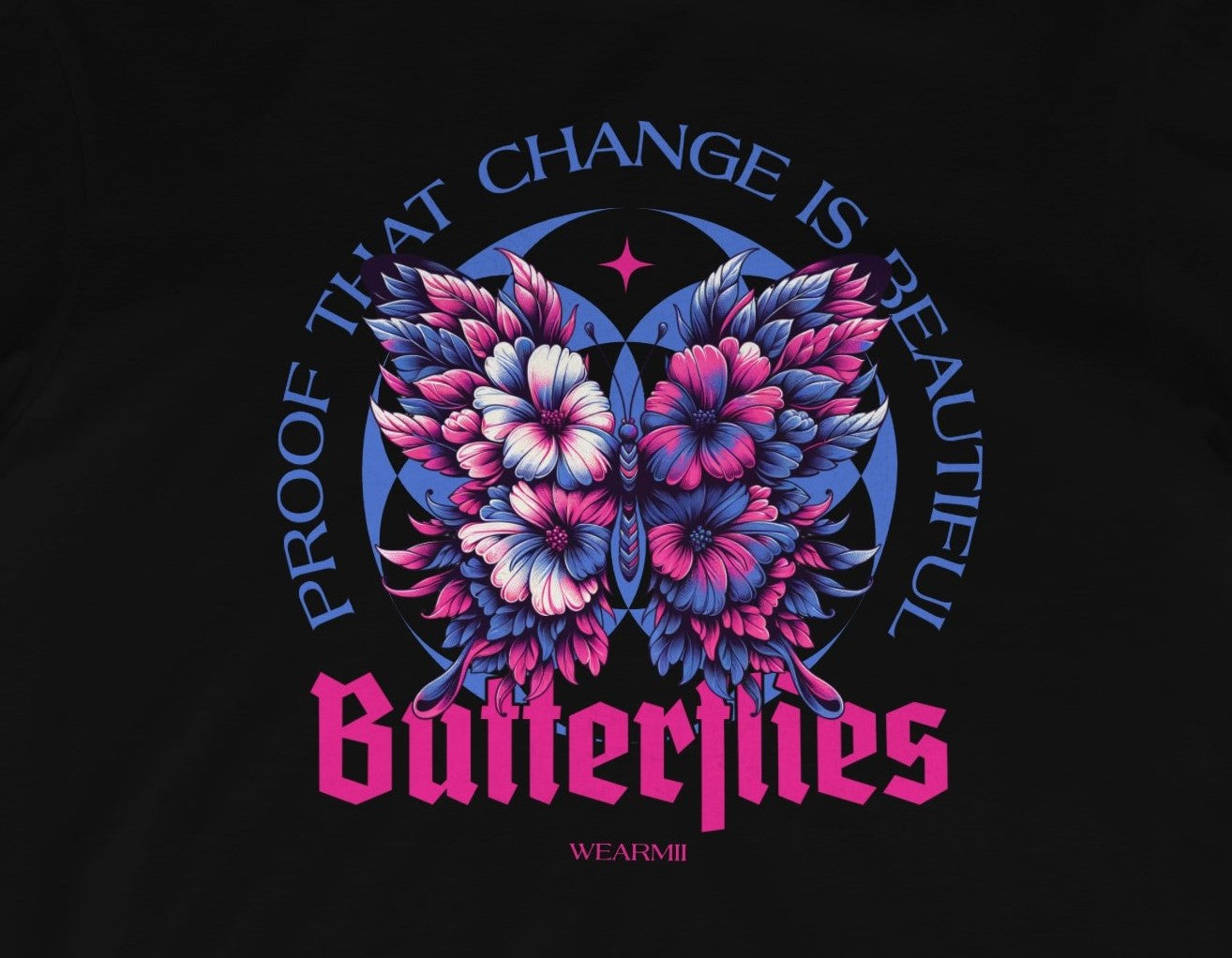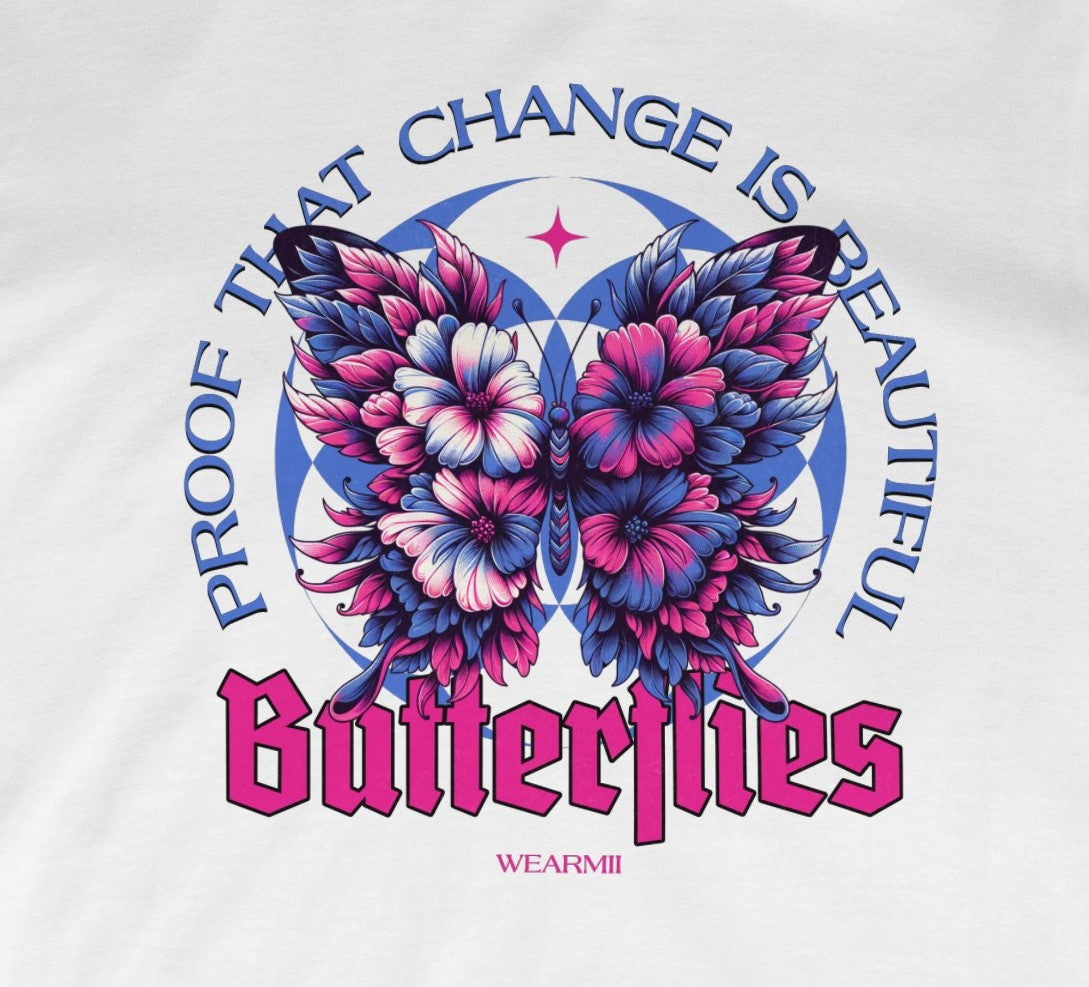 Celebrate transformation with the Butterflies design from Wearmii. Featuring a stunningly detailed butterfly formed from vibrant floral elements, framed by the empowering phrase “Proof That Change Is Beautiful”, this piece is a reminder to embrace growth and evolution.